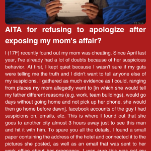 I (17F) recently found out my mom was cheating. Since April last year, I’ve already had a lot of doubts because of her suspicious behavior. At first,…