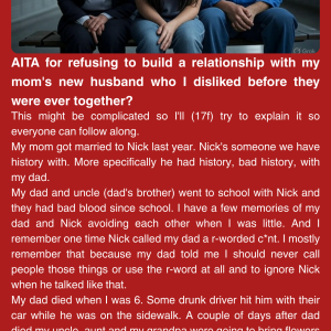 This might be complicated so I’ll (17f) try to explain it so everyone can follow along. My mom got married to Nick last year. Nick’s someone we…